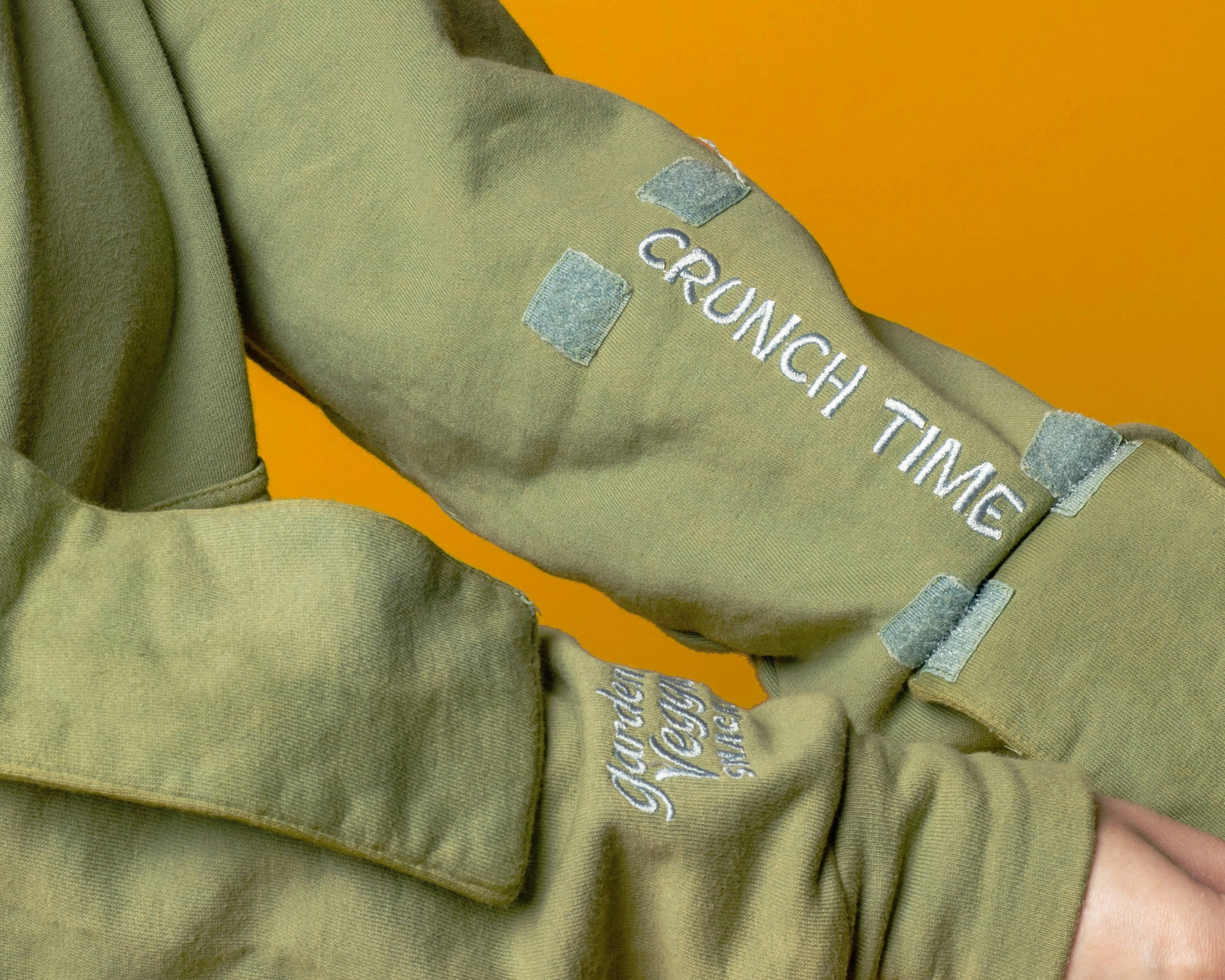- Wipe Zones: Removable, washable patches on the forearms and thighs for wiping during crunch-time moments so you can catch flavor-dust right where it lands and clean up without tearing yourself away from the game. Plus, each flexes a cheeky catchphrase – like “Crunch Time,” “Snack Goals,” “All Flavor, No Fumble,” and “Crumb and Get It” – because snacking in style is a whole vibe.